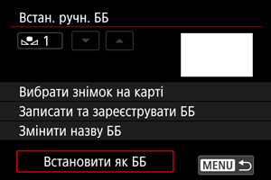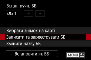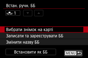 - На екрані [Встан. ручн. ББ] виберіть номер зареєстрованого ручного балансу білого, до якого потрібно додати назву.