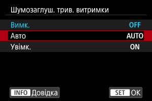 Функція зменшення рівня шуму спрацьовує для всіх зображень із часом експонування 1 с або більше. Вибір значення [Увімк.] дає змогу усувати шуми, які не визначаються в режимі [Авто].