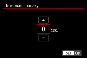 - Якщо встановити значення [0], сумісні спалахи Speedlite спрацьовуватимуть, а камера виконуватиме зйомку, щойно спалахи буде повністю заряджено. Застереження щодо безперервного спрацьовування наведено в інструкціях з використання сумісних спалахів Speedlite. У разі зйомки з використанням кількох сумісних спалахів Speedlite з бездротовим керуванням варто встановлювати довший інтервал.