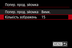 Коли використовується ця функція, автоматична зйомка в режимі безперервної зйомки починається ще до повного натискання кнопки затвора, якщо її ненадовго натиснути наполовину. Щоб підготуватися до попередньої безперервної зйомки, установіть кількість зображень, які має бути знято. Зауважте, що під час попередньої безперервної зйомки на екрані зйомки відображається індикатор [].