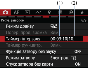 За допомогою таймера інтервалу можна встановити інтервал зйомки та кількість знімків, щоб камера знімала окремі кадри згідно із заданим інтервалом і завершила зйомку після досягнення необхідної кількості знімків.