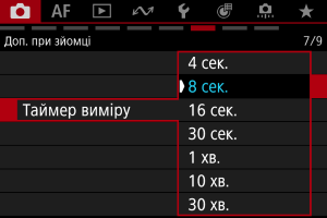 Можна встановити тривалість роботи таймера виміру (який визначає тривалість відображення величини експозиції / фіксації AE) після його ввімкнення, наприклад натисканням кнопки затвора наполовину.