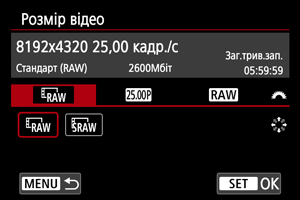 Можна встановити роздільну здатність, кадрову частоту й тип формату RAW для відеовиходу RAW.