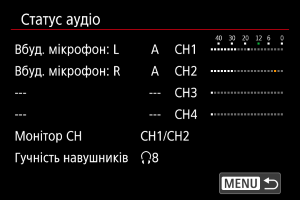 - Параметр [Монітор CH] відображає набір каналів, установлений у меню [Монітор зйомки CH] для параметра [Навушники] у розділі [