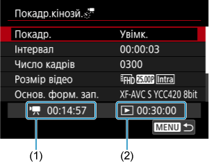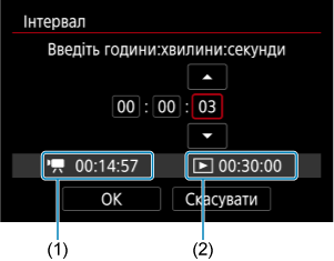 Вказує час, потрібний для зйомки заданої кількості кадрів з установленим інтервалом. Якщо значення перевищує 24 години, буде відображено «*** днів».