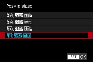 Буде відображено доступні значення розміру відео (комбінації роздільної здатності, кадрової частоти та стиснення). Доступні варіанти залежать від значення параметра [Основ. форм. зап.].