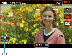 Щоб утримувати певне положення фокуса або не записувати звуки роботи механізму об’єктива, можна тимчасово призупинити слідкуюче автофокусування для відеозйомки, торкнувшись елемента [АФ Серво д/відео: пауза] (1) у лівій нижній частині екрана.