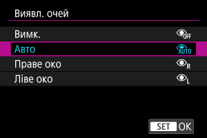 Якщо встановити для параметра [: Виявл. очей] значення, відмінне від [Вимк.] (), можна знімати об’єкт, так щоб його очі були у фокусі.