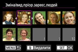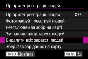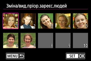 Ви можете зареєструвати людей у камері, щоб виявляти їхні обличчя й надавати їм пріоритет щодо фокусування, яскравості та кольорового тону під час зйомки. Щоб зареєструвати чиєсь обличчя, можна сфотографувати цю людину або скористатися зображенням на карті пам’яті.