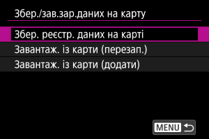 Щоб додати зареєстровані дані з карти на камеру, виберіть [Завантаж. із карти (додати)]. Жодні зареєстровані дані, наявні на камері, не буде видалено.