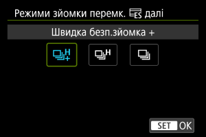 У режимі електронного затвора можна тимчасово змінити режим безперервної зйомки, натиснувши кнопку, якій призначено функцію [Режими зйомки перемк. далі] в розділі [