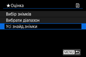 - Якщо вибрати значення [Усі знайд.знімки], усі відфільтровані за умовами пошуку зображення отримають задану оцінку.