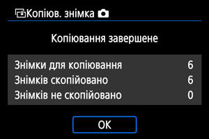 Якщо в папці призначення або на карті пам’яті вже міститься зображення з таким самим номером файлу, відображатимуться повідомлення [Пропустити знімок та продовжити], [Замінити існуючий знімок] і [Скасувати копіювання]. Виберіть спосіб копіювання й натисніть