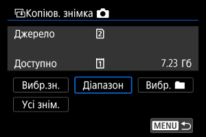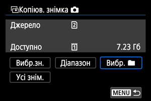 - Якщо вибрано параметр [Вибр.зн.], зображення в кількох папках не вдасться скопіювати одночасно. Виберіть зображення для копіювання з однієї папки за один раз.