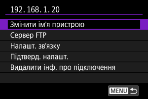 Перед тим як змінювати або видаляти параметри підключення для інших пристроїв, завершіть підключення Wi-Fi. У цьому розділі описано теми, які не розглянуто в розділі Настроювання параметрів зв’язку FTP-сервера.