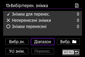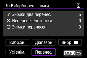 З екрана [Вибір/перен. знімка] можна вибрати кілька зображень і передати їх усі за один раз.