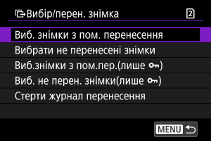 - Після стирання журналу перенесень можна вибрати пункт [Вибрати не перенесені знімки] і знову передати всі зображення, записані на карті.