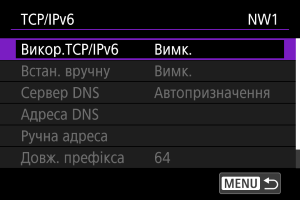 - Щоб призначити IP-адресу вручну, виберіть пункт [Увімк.]. Для параметра [Сервер DNS] установлено значення [Встан. вручну], отже можна настроїти параметри [Адреса DNS], [Ручна адреса], [Довж. префікса] та [Шлюз].