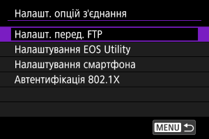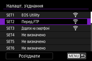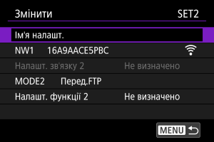 Можна перевірити, змінити або видалити параметри зв’язку та функцій, збережені на камері. Можна також налаштувати параметри, не встановлені за допомогою майстра підключення, наприклад параметр, який визначає дію в разі передавання на FTP-сервер файлу з тим самим ім’ям, що й у наявних файлів.
