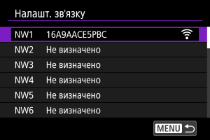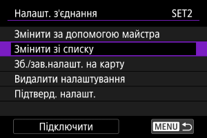 Якщо вибрати пункт [Вибрати зі списку], буде відображено список параметрів зв’язку, які збережено на камері. Виберіть параметри зв’язку для використання.