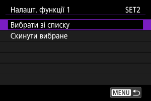 Якщо вибрати пункт [Вибрати зі списку], буде відображено список параметрів функції, що збережені на камері. Виберіть параметри функції, яку потрібно використовувати.