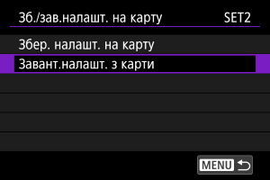 : Зб./зав.налашт.кам. на карту] дає змогу зберегти всі параметри зв’язку камери на карту або завантажити з карти всі параметри зв’язку на іншу камеру.
