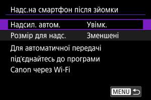Вибір пункту [Надс.на смартфон після зйомки] у розділі [Налаштування смартфона] дає змогу встановити розмір зображень, які надсилатимуться автоматично.