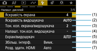 - (1) Яскравість екрана