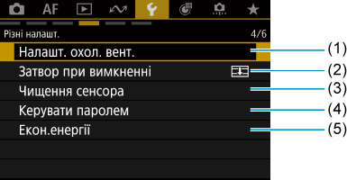 - Параметр [Налашт. охол. вент.] відображається, лише коли приєднано охолоджувальний вентилятор CF-R20EP (продається окремо).