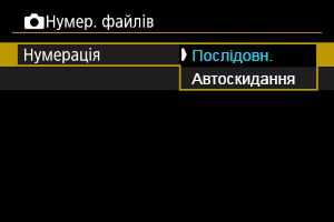 Зверніть увагу, що нумерація файлів може продовжуватися від будь-яких наявних зображень на картах або в папках, до яких виконано перехід. Якщо потрібно застосувати послідовну нумерацію, рекомендується завжди використовувати щойно відформатовану карту пам’яті.