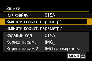 Користувацький параметр 1 дає змогу зареєструвати чотири символи на ваш вибір. Користувацький параметр 2 додає три початкові зареєстровані символи на ваш вибір до четвертого символу, що означає розмір зображення, який автоматично додається після зйомки.
