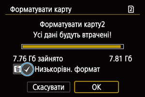 - Низькорівневе форматування можна скасувати під час його виконання, вибравши [Скасувати]. Навіть у цьому разі звичайне форматування буде вже завершено, і картою можна користуватися.