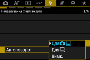 - Зображення, які було знято зі встановленим значенням [Вимк.] параметра автоматичного повертання, не повертатимуться під час відтворення, навіть якщо згодом для автоматичного повертання буде встановлено значення [Увімк.].