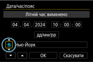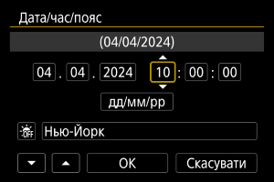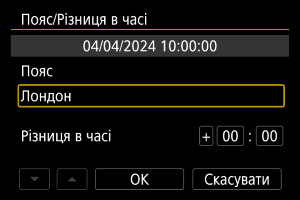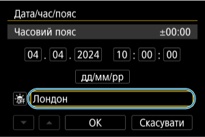 Під час першого вмикання камери, а також у разі скидання параметрів дати/часу/часового поясу виконайте наведені нижче дії, щоб передусім задати часовий пояс.