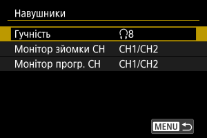 Можна вибрати комбінацію каналів для виводу через роз’єм для підключення навушників під час зйомки або відтворення. Цей параметр також застосовується для виводу через динамік ().