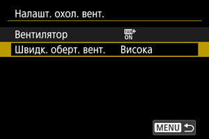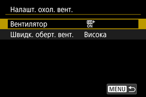 Коли використовується додатковий охолоджувальний вентилятор, його параметри можна вибрати на камері. Перед тим як налаштовувати параметри, під’єднайте охолоджувальний вентилятор ().