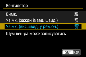 Вентилятор працює з високою швидкістю в режимі очікування і тоді, коли камера не записує відео чи звук. Під час запису звуку вентилятор працює зі швидкістю, заданою за допомогою параметра [Швидк. оберт. вент.].