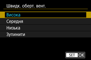 - Якщо для параметра [Вентилятор] установити значення [Увімк. (зажди із зад. швид.)], а для [Швидк. оберт. вент.] — значення [Зупинити], значення параметра [Швидк. оберт. вент.] буде автоматично змінено на [Низька].