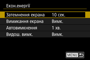 - [Затемнення екрана] і [Вимикання екрана] застосовуються під час відображення екрана зйомки. Ці параметри не застосовуються під час відображення меню або відтворення зображень.