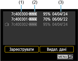 У камері можна зареєструвати максимум шість акумуляторів LP-E6P. Щоб зареєструвати кілька акумуляторів, для кожного з них потрібно виконати наведену нижче процедуру.