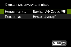 - Під час відеозйомки значення параметра [Функція кн. спуску для відео] матиме пріоритет над будь-якою функцією, призначеною для кнопки затвора в меню [