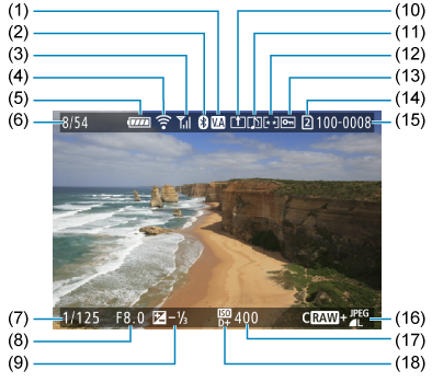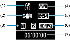 - (2) Кількість кадрів, які залишилися для брекетингу фокусування, мультиекспозиції або таймера інтервалу
