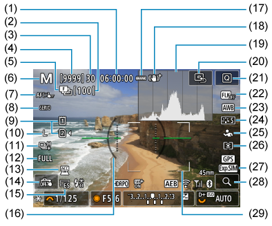 - (36) Індикатор рівня експозиції (величина корекції експозиції / діапазон AEB)