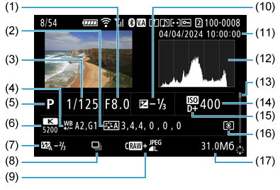 - Для зручності пропущено пояснення щодо елементів, які також включено до розділів Відображення основної інформації для фотографій і Відображення докладної інформації для фотографій 1 і тут не показано.