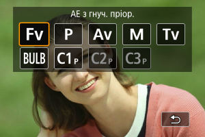 Коли встановлено режим [Fv], подібний до [P] або [Av], зйомка з повільною синхронізацією не використовується за слабкого освітлення, навіть якщо для параметра [Повільн. синх.] на вкладці [