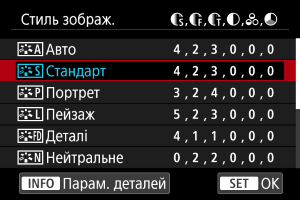 Піктограми на екрані вибору стилю зображення представляють значення [Інтенсив.], [Чіткість], [Поріг] для параметрів [Різкість], [Контраст] тощо. Цифри вказують на значення параметрів, установлених для відповідного стилю зображення.