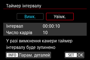 - Щоб припинити зйомку з таймером інтервалу, виберіть [Вимк.] або встановіть перемикач живлення в положення
