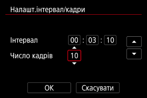 За допомогою таймера інтервалу можна встановити інтервал зйомки та кількість знімків, щоб камера знімала окремі кадри згідно із заданим інтервалом і завершила зйомку після досягнення необхідної кількості знімків.