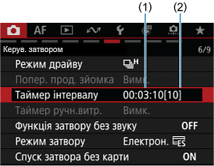 - Під час зйомки з таймером інтервалу не можна застосовувати режим Зйомка з дистанційним керуванням або зйомку з дистанційною активацією спалаху Speedlite.