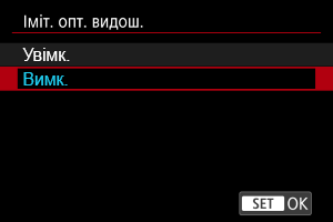 - Імітація оптичного видошукача не використовується під час відображення на зовнішніх моніторах, включно з одночасним відображенням на зовнішньому моніторі й екрані камери.
